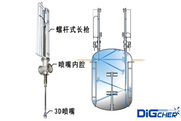 德高潔全自動不銹鋼反應(yīng)釜清洗系統(tǒng)具體清洗流程是將三維旋轉(zhuǎn)噴頭伸縮機(jī)構(gòu)安裝在反應(yīng)釜入孔上,伸縮桿伸進(jìn)反應(yīng)釜內(nèi),伸縮機(jī)構(gòu)可采用手動、電動、液壓等控制,伸縮桿在反應(yīng)釜內(nèi)伸縮和沿反應(yīng)釜內(nèi)壁周圍方向移動。根據(jù)具體實(shí)際情況可選用2孔或4孔三維自動旋轉(zhuǎn)噴頭,當(dāng)三維自動旋轉(zhuǎn)噴頭水平旋轉(zhuǎn)時,水射流形成的旋轉(zhuǎn)力矩帶動噴嘴在垂直面內(nèi)旋轉(zhuǎn)。由于三維旋轉(zhuǎn)噴頭與伸縮桿的復(fù)合運(yùn)動,高壓水射流可以覆蓋反應(yīng)釜內(nèi)任何位置,從而完成反應(yīng)釜的清洗。